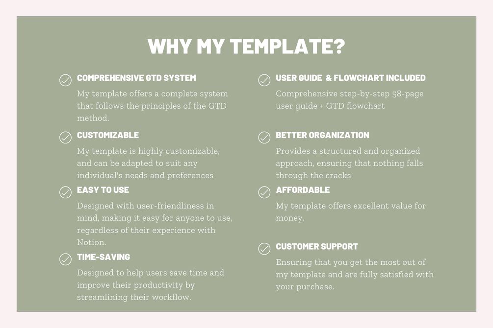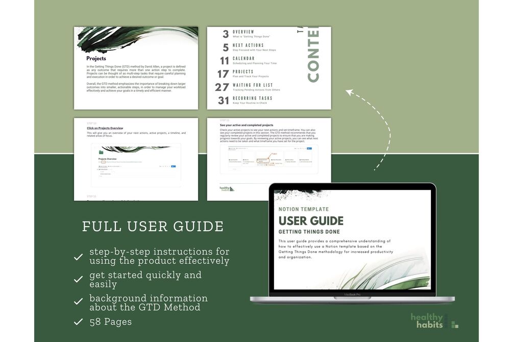 Full User Guide: The user guide is a comprehensive 58-page document that provides a detailed, step-by-step walkthrough of the Notion template based on the GTD methodology. It covers all aspects of the template, from inbox to organizing tasks into projects, next actions, waiting for, and someday/maybe lists. It also includes instructions on how to use the review and focus areas features. The user guide is designed to help you use the Notion template effectively and get the most out of the GTD method to increase your productivity and reduce stress.