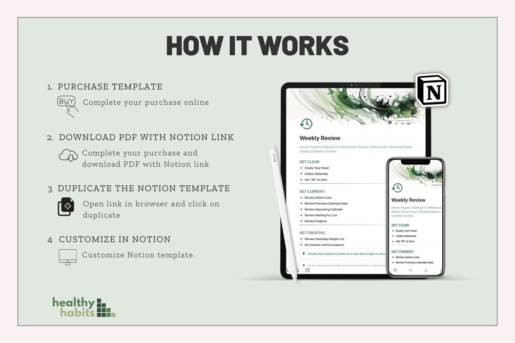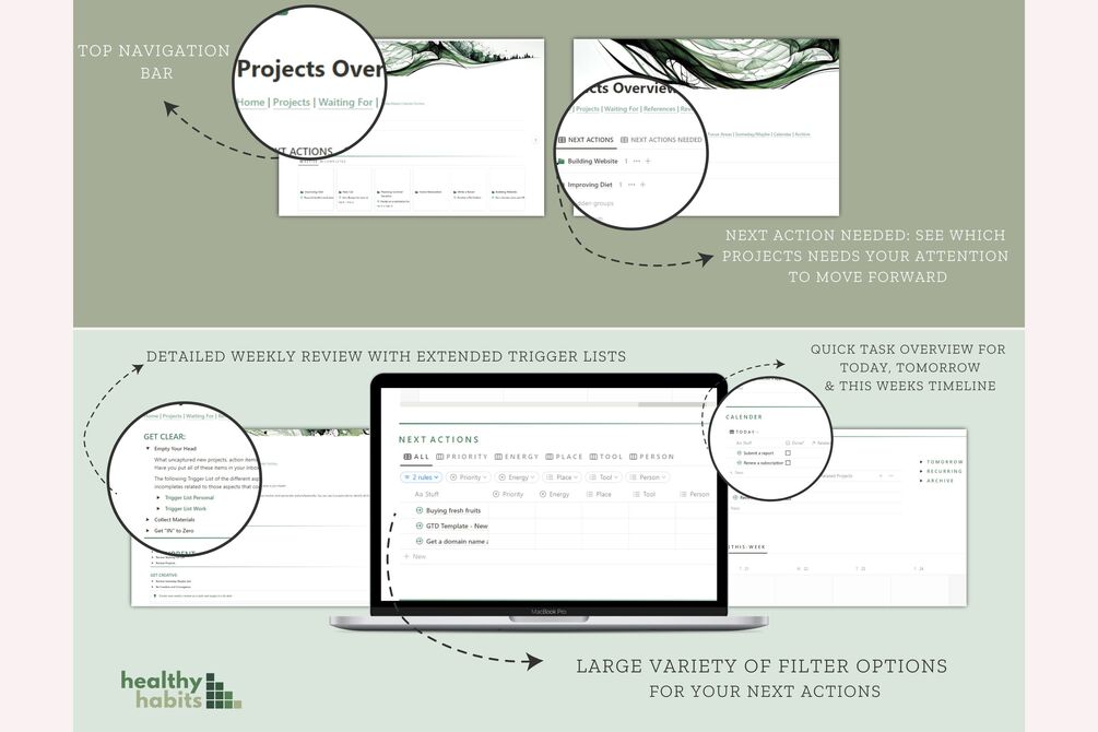 You'll get: The Ultimate GTD System in Notion - based on the 5 Steps of GTD, a Visualization of the GTD Workflow in a Flowchart and a 58-page Full User Guide that provides a detailed, step-by-step walkthrough